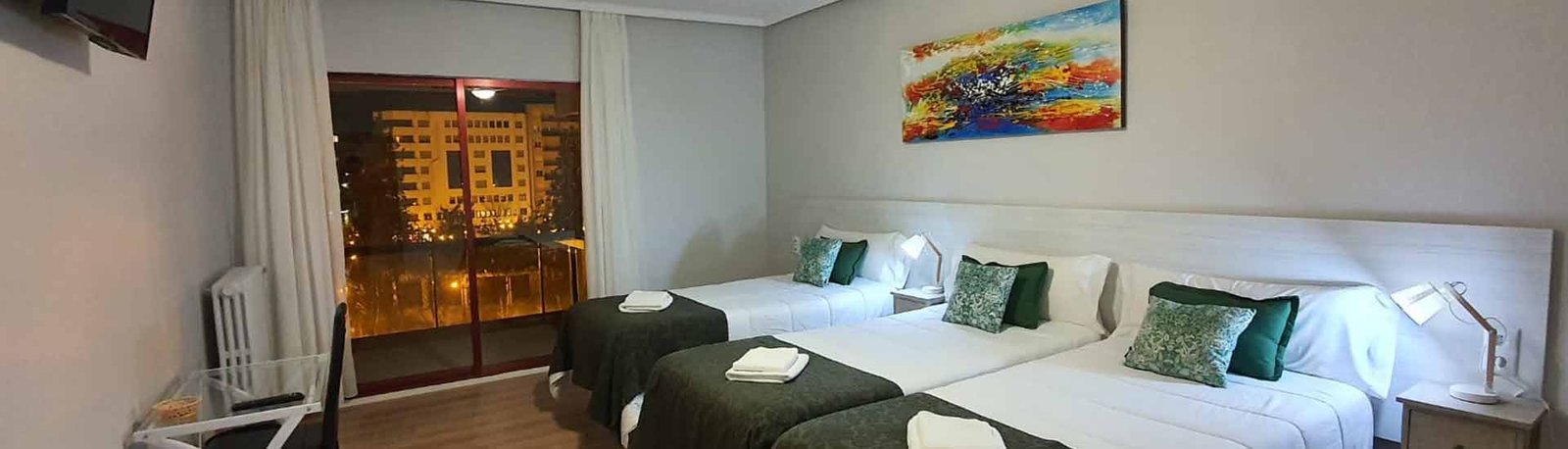 Pensión Muro de la Mata de Logroño, dispone de habitaciones individuales, habitaciones de dos camas y habitaciones triples (con tres camas). Se encuentra en el pleno Centro de la Ciudad de Logroño en el propio Paseo del Espolón, a dos minutos caminando de la Calle San Juan y a tres de la Calle Laurel, muy cerca del ayuntamiento de Logroño y a un paso del centro histórico. Dispone de zona donde poder tomar, cafés y tes para los ocupantes de la pensión e información turística variada. Equipada con TV en todas las habitaciones y wifi gratuita para sus ocupantes. Posiblemente, a día de hoy Pensión Muro de la Mata de Logroño se puede considerar la mejor pensión de la localidad. Es una pensión limpia, cómoda y en una zona privilegiada y con una característica que la hace única: sus vistas inmejorables sobre el Paseo del Espolón y sobre el Casco Histórico de la Ciudad, incluyendo su majestuosa Concatedral de La Redonda, vistas que podrás disfrutar desde tu propia habitación, según la zona de nuestra Pensión en la que te alojes.